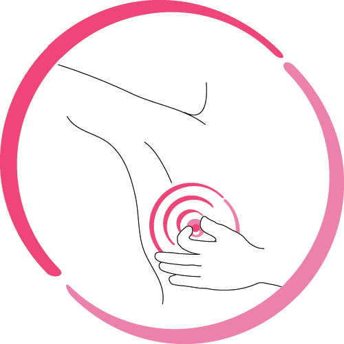 Con tu mano izquierda y usando las yemas de tus dedos índice, medio y anular, presiona suavemente con movimientos circulares, puedes comenzar desde el pezón hacia la periferia dando vuelta a toda la mama. Palpa toda la superficie prestando atención en cambios de textura, presencias de masas o dolor.